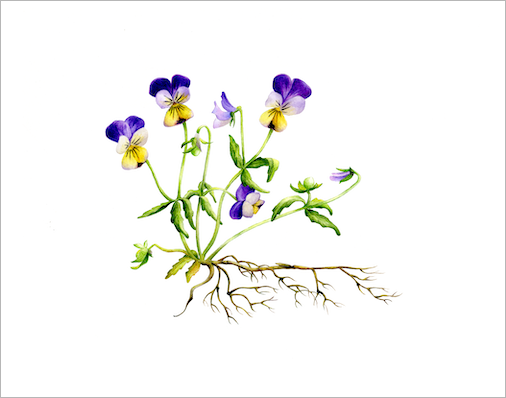 This composition was painted in watercolour, in a traditional botanical style incorporating the roots into the piece. This native plant produces many colourful and solitary perky blooms, which can be grown from seed, but with its strong root system it can multiply easily. “Tricolour” refers to the species from the Pansy Violet. This plant with its pretty little flowers was a favourite in my mother’s garden and frequently graced our family dinner table in small and sweet bouquets.